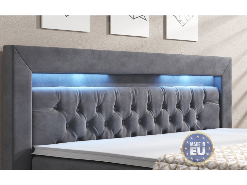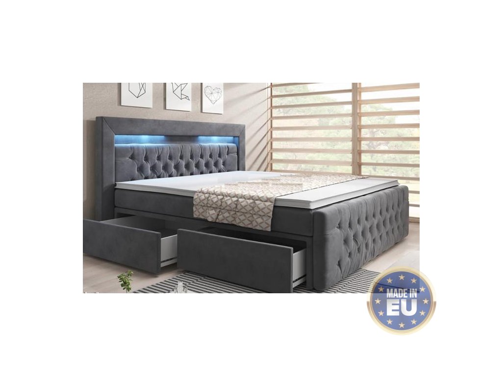 Boxspring postel SERA s úložným prostorem (4 šuplíky) a LED, 180×200 cm, šedá látka