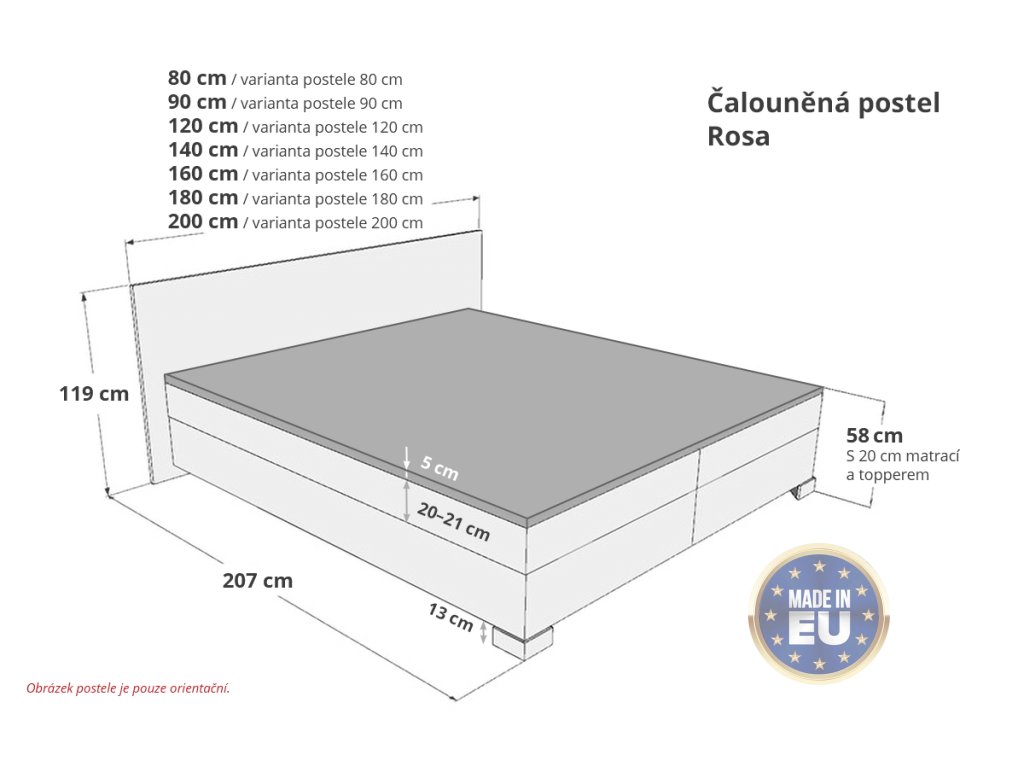 Čalouněná postel Rosa s úložným prostorem, matrace, rošt a topper v ceně, 180 × 200 cm