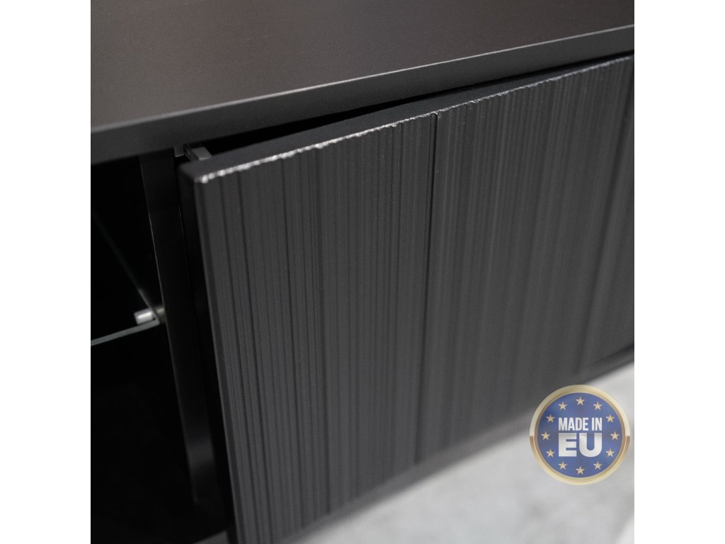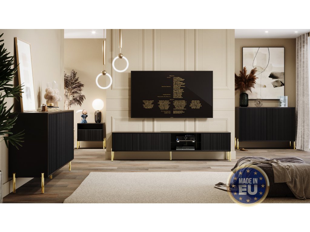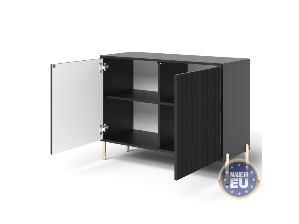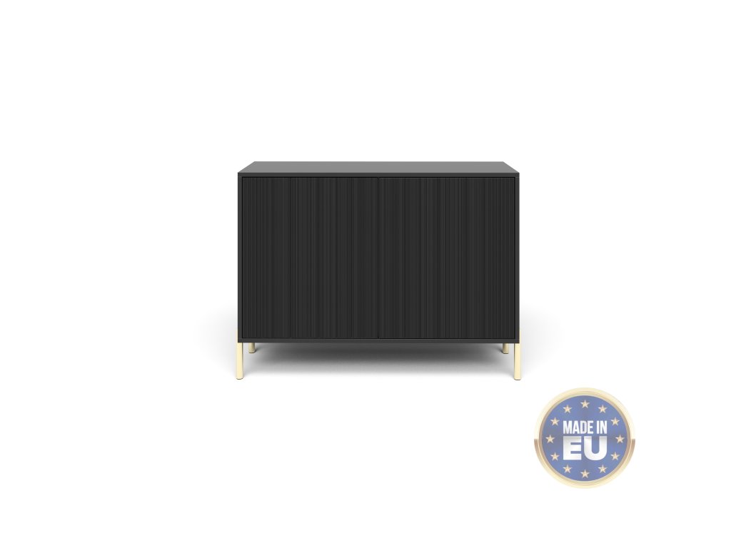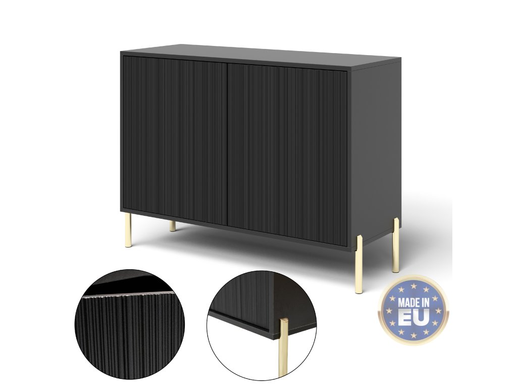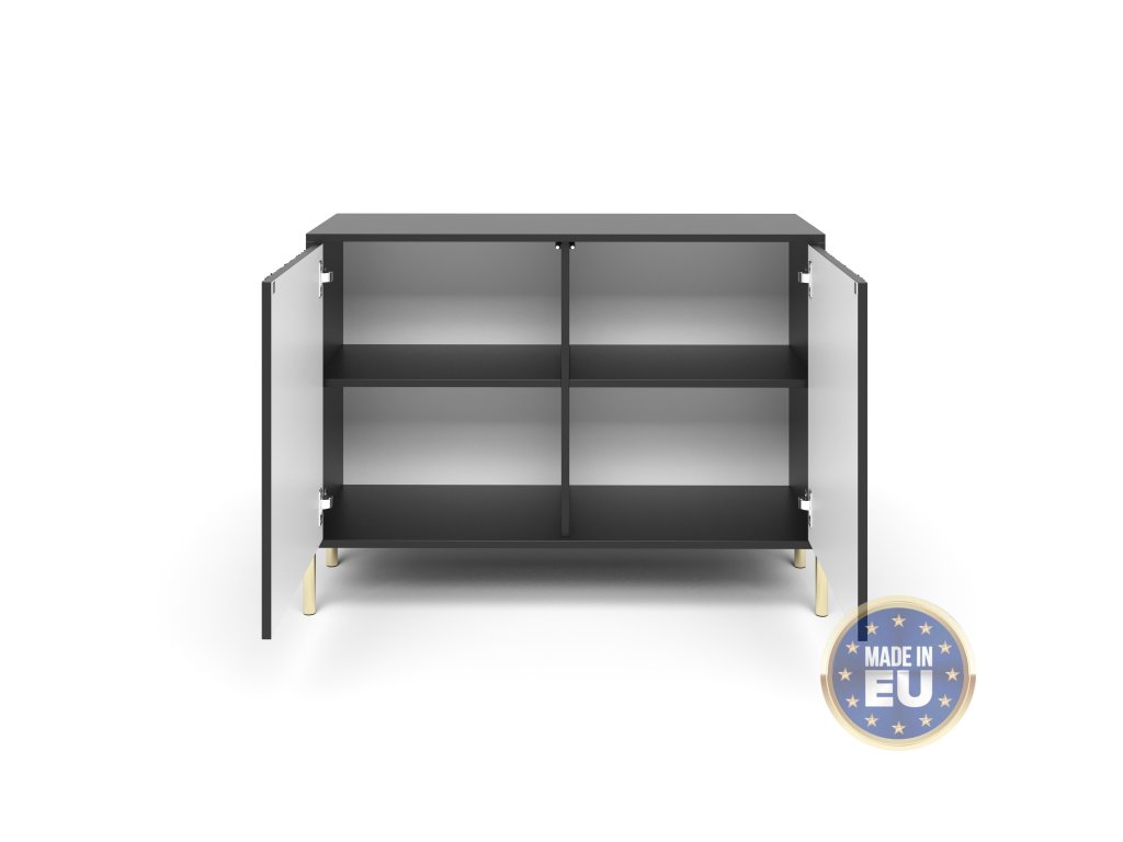 Korpus z odolné laminované desky zvládne každodenní provoz bez obav ze škrábanců. Díky 15cm vysokým nohám ve zlaté barvě působí lehce a elegantně, a navíc usnadňuje úklid pod nábytkem.